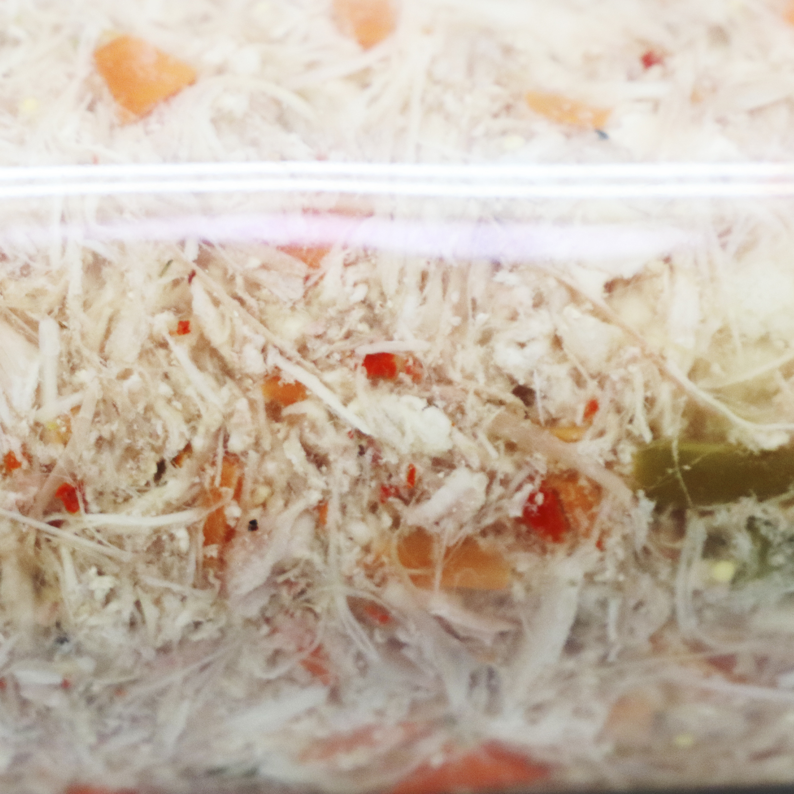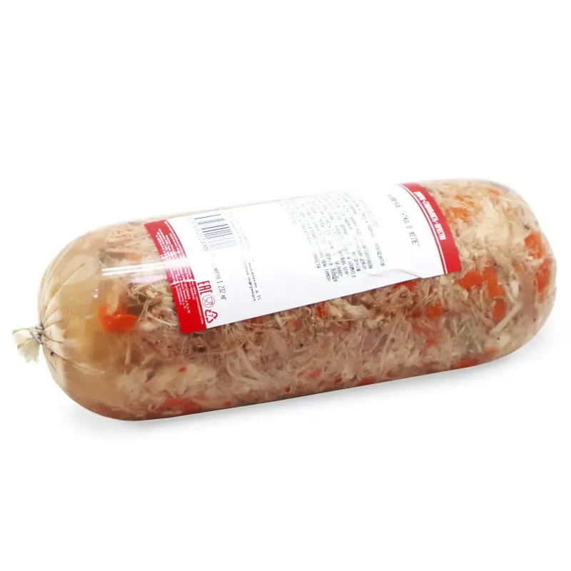 Мясо утки, мясо куриное, вода, овощи (брокколи, морковь), желатин, соль пищевая, комплексная добавка (ароматизатор, чеснок сушеный, соль, экстракты пряностей (перец черный), усилитель вкуса и аромата Е621, регулятор кислотности Е262, Е331.